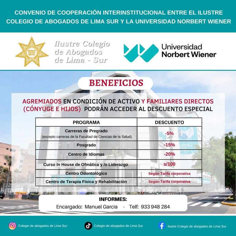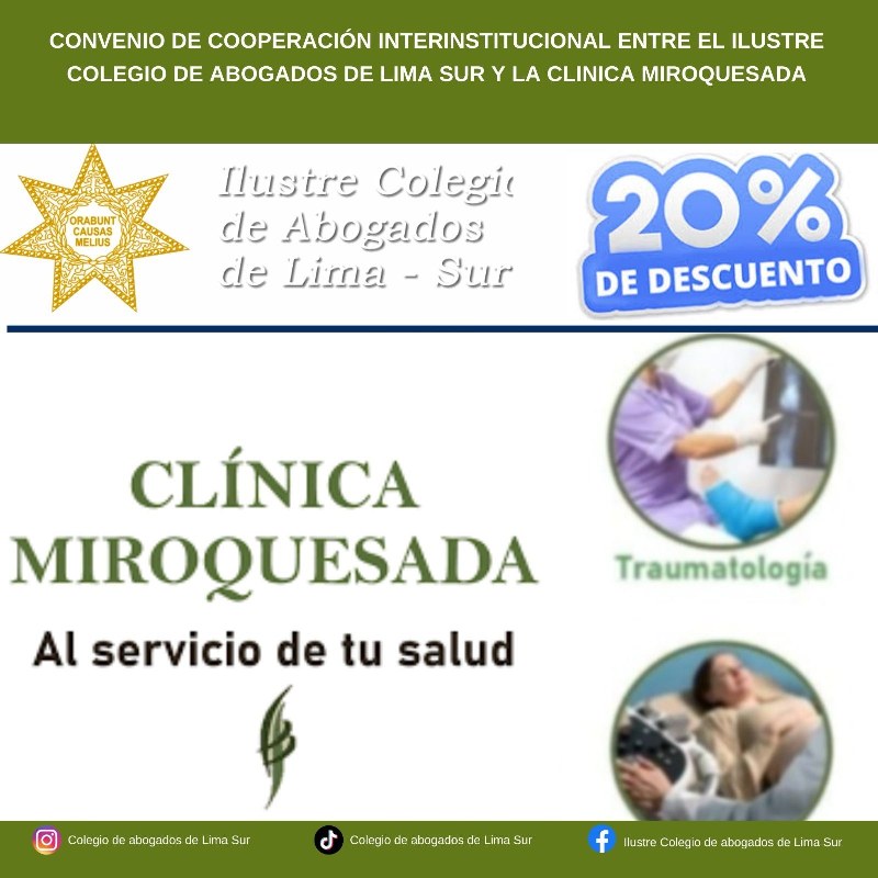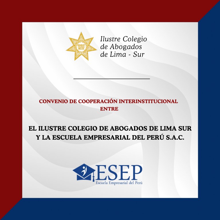 CONVENIOS CON UNIVERSIDADESUniversidad de Castilla España Universidad de Salamanca España Fundación General de la Universidad de ValladolidUniversidad San Juan BautistaDescargar ConvenioUniversidad Norbert WienerDescargar ConvenioEscuela de Administración de Negocios para Graduados - Universidad ESANDescargar ConvenioPontificia Universidad Católica del Perú - PUCPDescargar ConvenioUniversidad Señor de SipánDescargar ConvenioUniversidad Cesar VallejoDescargar ConvenioUniversidad Autónoma del PerúDescargar ConvenioCONVENIOS CON CENTROS DE CAPACITACIÓNEscuela Empresarial del Perú SACDescargar ConvenioEscuela Nacional de Capacitación y Negocios - ENCANDescargar ConvenioInstituto de Educación Superior Tecnológico - ICJDescargar ConvenioInstituto Peruano de Gobierno - IPEGDescargar ConvenioCentro de Altos Estudios de Fomento y Capacitación - CIESDescargar ConvenioGaceta JurídicaDescargar ConvenioVILLASAN - Centro de Estudios PsicojurídicosDescargar ConvenioCentro de Formación y Capacitación de Conciliadores - PATMOSDescargar ConvenioCentro de Formación Profesional TALENTUMDescargar ConvenioCentro Especializado en Derecho Registral y Notarial - CEDRENDescargar ConvenioCONVENIOS CON CENTRO DE IDIOMASBritánicoDescargar ConvenioCentro Cultural Perú BrasilDescargar ConvenioCONVENIOS DE BIENESTARSoho ColorDescargar ConvenioCentro de Terapias y Aprendizaje AKASHA SACDescargar ConvenioInstituto Peruano de Paternidad Responsable - INPPARESDescargar ConvenioFree Figth System Marin SACDescargar ConvenioMultidentDescargar ConvenioLaboratorios BIOLINKSDescargar ConvenioAudioprótesis Centro AuditivoDescargar ConvenioÓpticas MonteroDescargar ConvenioClínica MiroquesadaDescargar ConvenioCONVENIOS CON LIBRERÍASUbi Lex Asesores SACDescargar ConvenioAula GacetaDescargar ConvenioINSTITUCIONALESMINJUSDescargar ConvenioIlustre Colegio de Abogados de MadridDescargar ConvenioWorld Compliance AssociationJurado Nacional de EleccionesDescargar ConvenioCorte Superior de Justicia de Lima SurDescargar ConvenioMinisterio PúblicoDescargar ConvenioIlustre Colegio de Abogados de ApurimacDescargar Convenio