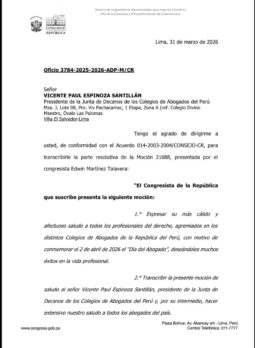 El Dr. Vicente Paul Espinoza Santillan presidente de la Junta Nacional de Decanos de los Colegios de Abogados del Perú (Judecap), participó en el 168 aniversario de la Benemérita Sociedad Fundadores de la Independencia, Combatientes del 02 de mayo de 1866 y Defensores Calificados de la Patria, en dicho acto, se entregó reconocimiento institucional al General de División (r) Carlos Tafur Ganoza presidente de la Benemérita Sociedad Fundadores de la Independencia (BSFI), destacando su importante labor en fortalecer la memoria histórica de nuestra Nación.